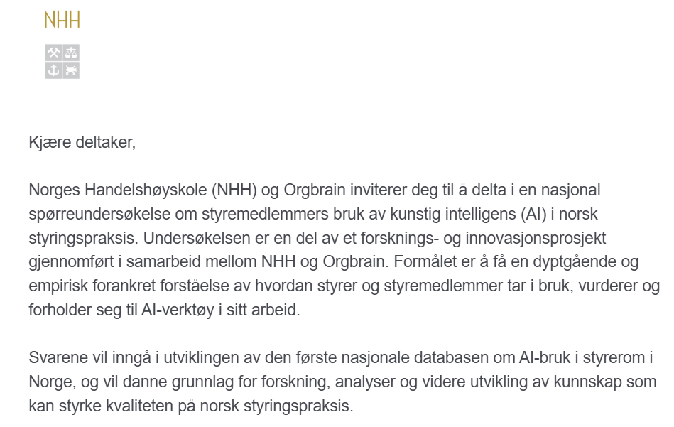 Hvordan ligger Norge an? For å finne svar skal Orgbrain og Norges Handelshøyskole, NHH, gjennomføre en nasjonal undersøkelse i første kvartal 2026, for å kartlegge hvordan norske styrer faktisk bruker AI, og hva som hindrer trygg og effektiv bruk. Undersøkelsen skal kartlegge hvor utbredt AI er i styrearbeid, hvilke verktøy som brukes, hva de brukes til, og hvilke gevinster, risikoer og barrierer styremedlemmer opplever.